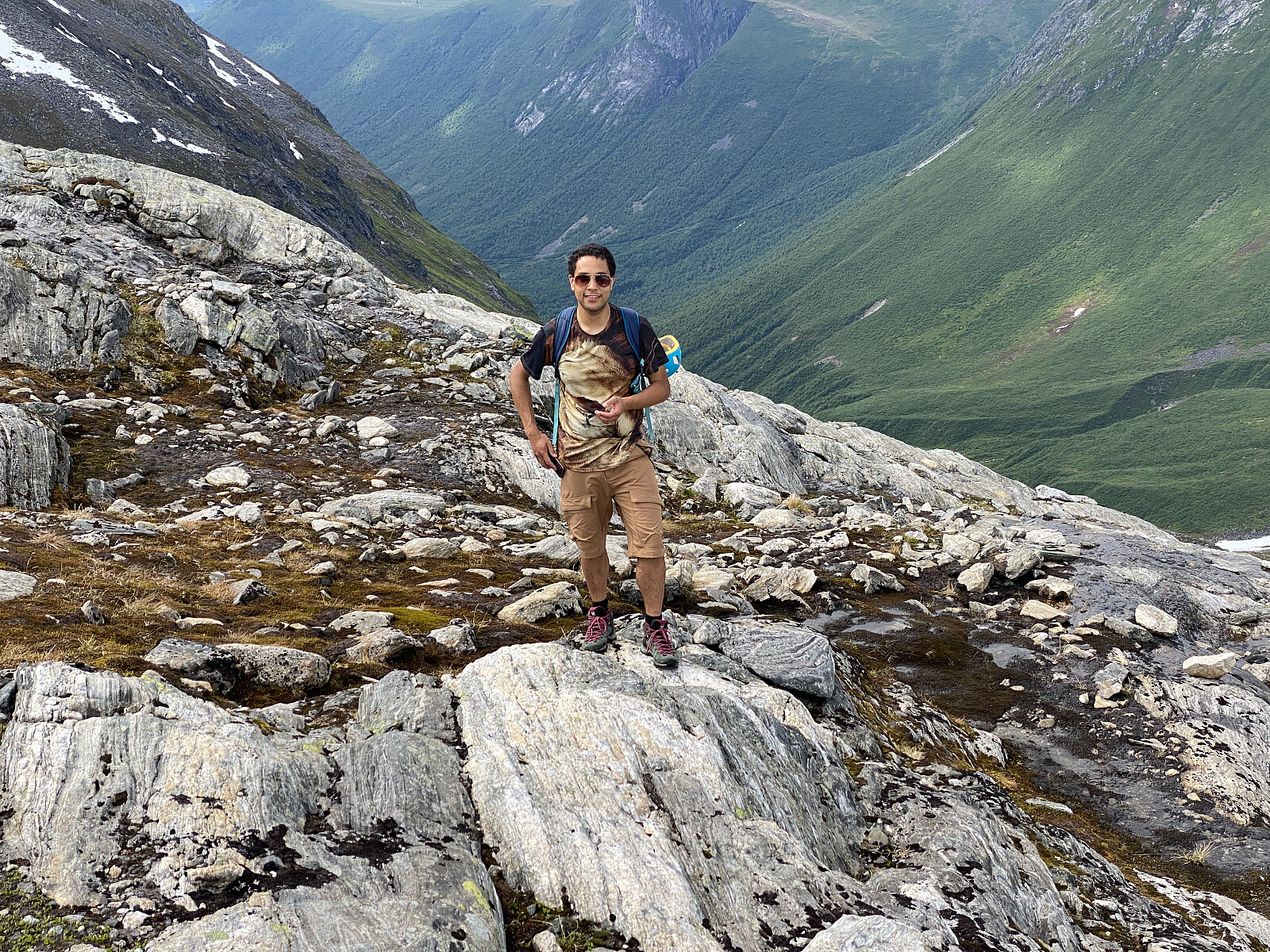 Nede i skaret mellom 1499-knausen og resten av nordryggen, tok vi så på oss kjettingbrodder (Snowline Pro), og tok oss fra skaret og ned på snøen/isbreen, som bare manglet et par-tre høydemeter på å nå helt opp i skaret. Breen var her temmelig bratt helt i starten, men med Snowline-brodder gikk det nokså greit å gå nedover (video #1). Etterhvert som breen flatet litt ut, kunne vi så speede opp tempoet litt; og slik fortsatte vi nedover nesten til vi var nede igjen ved 1097-vatnet ("Nyheivatnet"). Jeg er sikker på at vi sparte i hvert fall 30 minutter på å gå raskt nedover breen/snøen med brodder på denne måten, sammenlignet med om vi skulle hoppet fra stein til stein nedover der vi var kommet opp. Turen videre nedover forløp uten noen større begivenheter. Vi var ikke nede ved bilen igjen før i ni-tiden på kvelden, men det er jo lange lyse kvelder (og netter) på denne tiden av året, så det var helt uproblematisk.