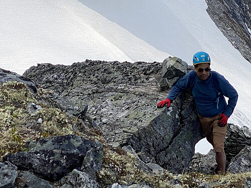 Vi sa høflig adjø til de to damene, og ønsket dem god tur ned igjen. De skaffer seg nok mer trad-erfaring etterhvert, og så kan de forsøke å ta denne turen på nytt en annen gang. Men, som Dag påpekte, da vi var blitt alene, så ville det nok ikke hjulpet dem om de hadde kommet seg over fra isbreen til sørryggen; for om du ikke kommer deg forbi cruxet på nordryggen med såpass god utrustning som de hadde, så kommer du deg antagelig ikke opp siste partiet på sørryggen heller, for det er vanskeligere. Nordryggen på Gjuratinden har en liten knaus som rager ca. 1499 m.o.h., og som er adskilt fra resten av nordryggen med et lite, ca. 4 meter dypt skar. Vi entret nordryggen litt nord for denne knausen, og fulgte så ryggen sørover, over knausen, og ned i skaret. Etter skaret bratner ryggen betydelig til, men dette partiet er likevel ikke krevende å gå/klyve, før man ved ca. 1600 høydemeter kommer til det ovenfor utførlig omtalte cruxet. Turen oppover nordryggen gikk nokså radig, og forseringen av cruxet gikk veldig greit. Jeg hadde kløvet over svaberget før, og satte kanten på ene fjellstøvelen mot en liten uregelmessighet på svaberget som jeg husket fra sist, mens jeg hadde gode tak med begge hender i overkant av svaberget. Dag fant en litt annen måte å komme seg over cruxet på. Han holdt seg mer inni kroken mellom svaberget og fjellet ovenfor, men også han holdt seg fast i overkant av svaberget, inntil han reiste seg opp, og tok tak i fjellet ovenfor (se bildene ## 9 & 10 og video #19.