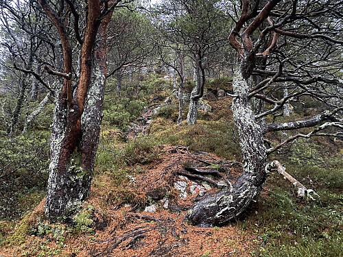 Akkurat på denne knausen er det egentlig et fint utsiktspunkt, men akkurat i dag var det ikke mulig å se noe som helst derfra. Vi vendte derfor ryggen til «utsikten», og fulgte i stedet fjellryggen nordøstover opp til det høyeste punktet på Vardfjellet. Herfra bar det så ned i Seterdalen, som er navnet på skaret mellom Vardfjellet og Rishaltheia, men vi skulle ikke mer enn 32 høydemeter ned før det igjen bar oppover. Til tross for regntøy var vi søkk våte når vi ankom toppen på Rishaltheia; og fuktighet på kameralinsene, i tillegg til at det var begynt å bli mørkt, gjorde det håpløst å få brukbare bilder der oppe fra (bilde ## 5 & 6). Før vi tok fatt på turen ned igjen, var det på tide å finne frem hodelyktene våre, men det viste seg at Dag hadde glemt å putte sin i sekken, og dermed ble det til at vi måtte klare oss med lyskjeglen fra den ene hodelykta vi hadde. Turen ned igjen fulgte samme trasé som vi hadde fulgt oppover, med unntak av at vi nå klarte å holde oss til stien der vi hadde mistet den på vei oppover, pluss at vi ett eller to steder lengre nede havnet på en alternativ sti et kort stykke. Hadde det vært glatt og lett å skli på vei oppover, føltes det enda verre på vei ned, og når snøen og isen to slutt på omkring 200 høydemeter, så var det både gjørmete partier og glatte trerøtter i stien, så vi måtte fortsatt gå forsiktig videre nedover. En fordel med å komme ned i skogen var selvsagt at man kunne støtte seg til, og holde seg i trærne langs stien, og unngå å falle på den måten. Deilig var det uansett å komme ned igjen til bilen, og få på seg tørre klær. På en dag som denne er det alpha og omega å ha et tørt klesskift liggende klart i bilen.