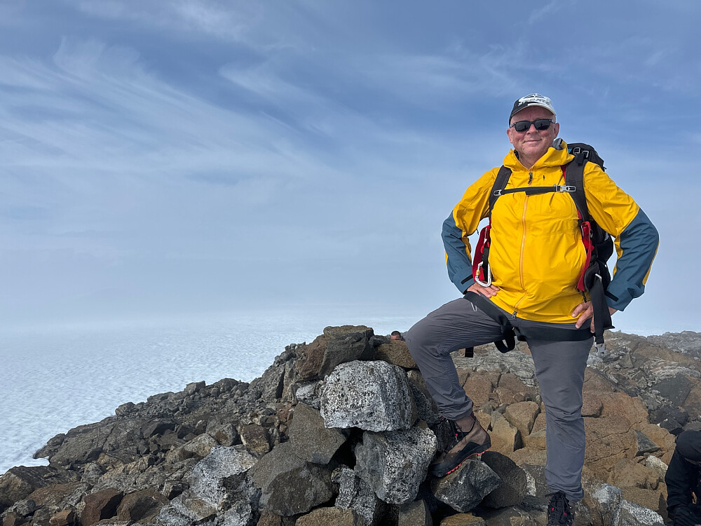 Ddt brøt ut spontan jubel, og ikke mindre jubel ble det da tåken kort tid etter ankomst toppunktet lettet og vi kunne skue utover et tåkehav med oppstikkende topper, særlig mot sørvestlig/vestlig kant, der Tore med sikker lokal geografikunnskap kunne innvie oss søringer i hva det var vi så.