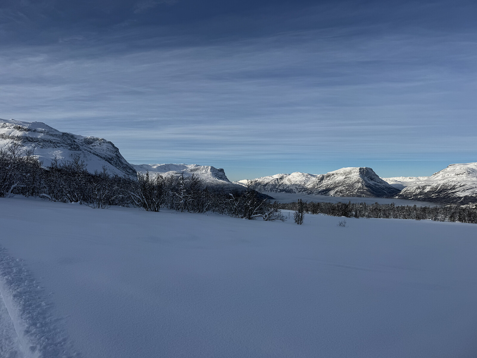 Austanbotntindane kan skimtes like til høyre for den bratte nordveggen av Bergsfjellet