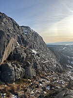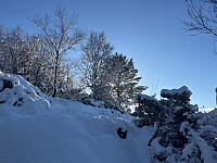 Ville få «rundt tall» for antall bestigninger av hjemlig kommunetopp i dag, og nok en gang denne fantastiske vinteren sol og bare et par blå. Etter brattøkt siste biten nøktern feiring med god drikke og litt forfriskninger på toppen delvis i le av en kald østlig trekk, med flott utsikt mot sør hvor Marsteinen etter hvert gled inn i solens flomlys. Kom i prat med dame som hadde sittet på sørsiden av varden; det var hennes første tur på Liatårnet og hun uttrykte stor begeistring over både landskap og utsikt! Jeg viste henne «normalvei» klyveskar ned fra toppryggen. Takk for meget hyggelig samtale; og gjensidig milepæl; 1 og 100. [[map:statkart|trackWeight normal|trackColor #FF0000|framed|90