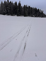 Oppe på vannet var det stukket opp og kjørt skiløype med snøskuter. Siden jeg holder på med turskøyting hadde jeg med fullt sikkerhetsutstyr (isstaver for å teste isen løpende, ispigger, kasteline og fullt skift i tilfelle) Det er allikevel ikke bare å surre rundt på isen så ikke gjør dette om du ikke har iskompetanse, sikkerhetsutstyr og turvenn med. Som man kan se når man går langs Skarselva oppover til Øyungen er det ganske mye vann som beveger seg gjennom Øyungen og skaper strømninger og derved tynn is på uventede >>>