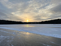 Hyttevei ganske langt oppover i lia og fin sti etterpå var jo behagelig. Og så viste det seg at det var et nydelig område der oppe med mange fine topper rundt et vakkert vann, Mellomnattetjern, islagt for anledningen. Flott utsikt til Norefjell sørover og Nesfjellet nordover. Veldig vakkert i kveldssola.
