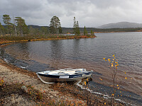 Jeg fulgte veien mot Gressåmoen, men etter 7 kilometer valgte jeg veien mot Leirsjøen ( 7 km fra kryss) som går langs Nordlandsbanen. Bru over Embrigtfossen og elva Luru. Ved veiens ende var det laget en flott gapahuk med bålplass. Her har Snåsa Fjellstyre en flott alubåt som kan brukes gratis. Alle under 20 år fisker gratis . Honnør til Snåsa Fjellstyre. Jeg startet vandringen langs ei fin sandstrand ved Leirsjøen. Her var det et bånd fra Snåsatur . Jeg forlot stien og gikk i fint terreng opp til toppen av Kittilåsen på 390 moh. Her var det en liten varde og et trigpunkt. Flott utsikt. På tur ned fant jeg stien til Snåsaturen og fulgte denne. >>>
