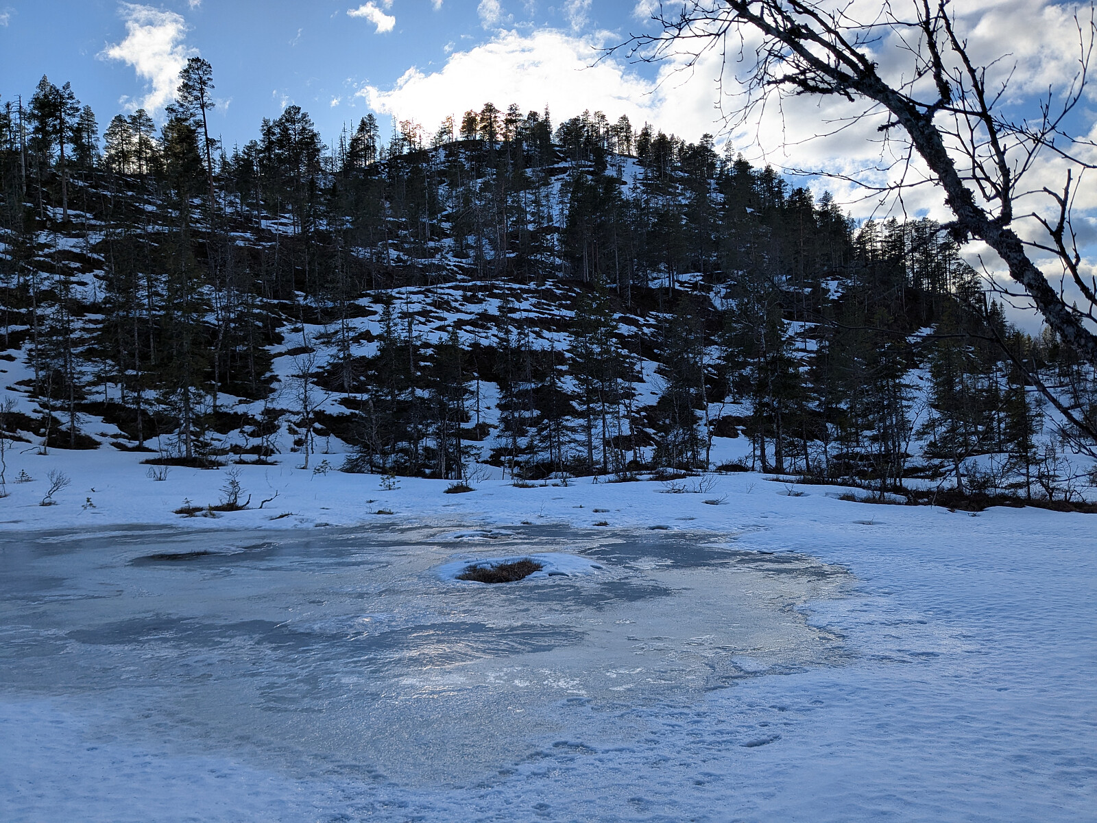 09.03.2025 SMÅKNEPPAN (OVERHALLA 31 AV 34) Etter nye målinger har det kommet 4 nye topper i Overhalla Kommune. Parkerte ved bommen til Stormyra Avfallsanlegg og fulgte veien inn mot Stormyra. Videre til høyre etter islagt vei inn til et dynamitt lager. (2 kilometer hit) Gikk over Sandmoelva og fulgte en traktorvei som går til Storflisingen (Gravdalshavet) Delvis snø og skare innover her, men skaren holdt ikke hele tiden, så føttene sank ned en halvmeter flere ganger. Tung tur. 1,5 kilometer før Flisingen gikk jeg rett vest opp mot snaufjellet (2,5 km etter traktorveien). Bedre skare oppe i høyden. En god del spor etter rein her, men jeg så ingen. Gikk først til høyeste punkt på Småkneppan 478 Moh. Flott utsikt her og fortsatt mulig å bruke ski her så lenge det varer. Jeg gikk >>>