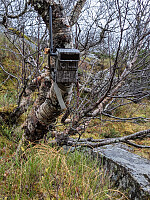 Ny dag og ny start fra Austdalen Parkering. I dag skulle jeg gå en rute ingen på PB har registrert. Jeg gikk først etter Juvassveien, en privat vei som er stengt med bom. Denne veien fortsetter som sti mot Juvatnet. Jeg forlot stien og gikk øst for Blankheia, og videre i myrlendt terreng mot vann 383. Videre i flott terreng opp mot høyde 463. Jeg gikk ned mot vann 392, men nederst her er det ei dyp kløft som jeg var usikker på om det var mulig å krysse, men plutselig dukket det opp en sti ned på siden av kløfta. Helt nederst i kløfta var det hengt opp et viltkamera, så her ble jeg avbildet. Turen opp til den spektakulære sør-ryggen av Juvassklumpen gikk fint. Lett å bestige fra nord, med sti mot toppen. Flott utsikt fra varden mot det store Juvatnet nedenfor. Retur samme vei >>>