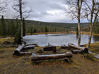 Torsdag 18.09.2025. Ny tur til Namsskogan. Kjørte E6 mot Trones. Like før Trones til venstre mot Strompdalen. Etterpå til høyre etter Ausvassråveien. Kr 70 i bompenger, men flott vei i vakker natur. Ved Osvatnet er det ei utleiehytte. Ved Millavatnet er det en Gapahuk og en demning. Ved Ausvatnet er det en flott liten avstikker ned til vannet med benker og bord, med flott utsikt mot fjellrekka i nord. Fortsatte forbi Kroktjønna og parkerte ved veiens ende ved Råsætra. Gikk rett nord i lett terreng til tross for bra stigning. Ved Sæterdalen krysset jeg en tørrlagt elv og fortsatte opp i snaufjellet. En del småtjønner på toppområdet. Ved vann 761 var det en del steinblokker som måtte passeres. Like før toppen ligger vann 800. Lett å passere på begge sider. På den markerte >>>