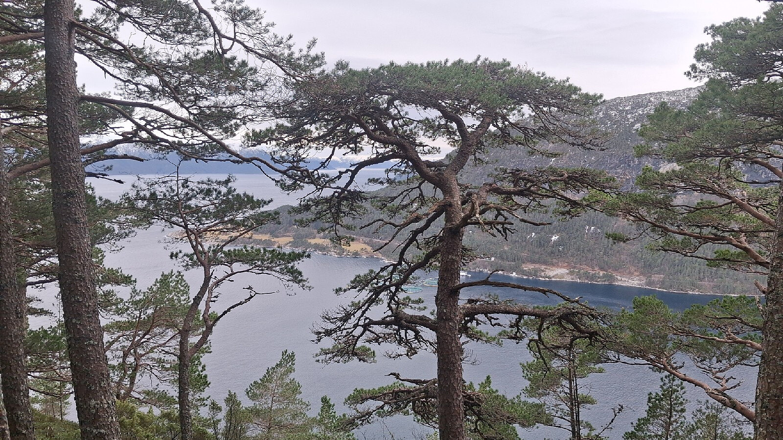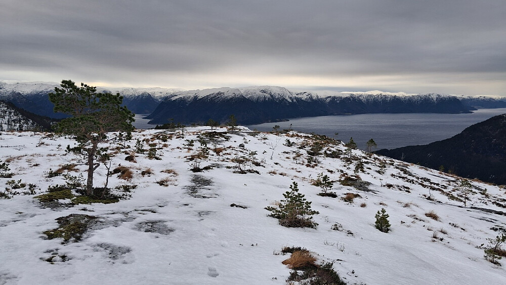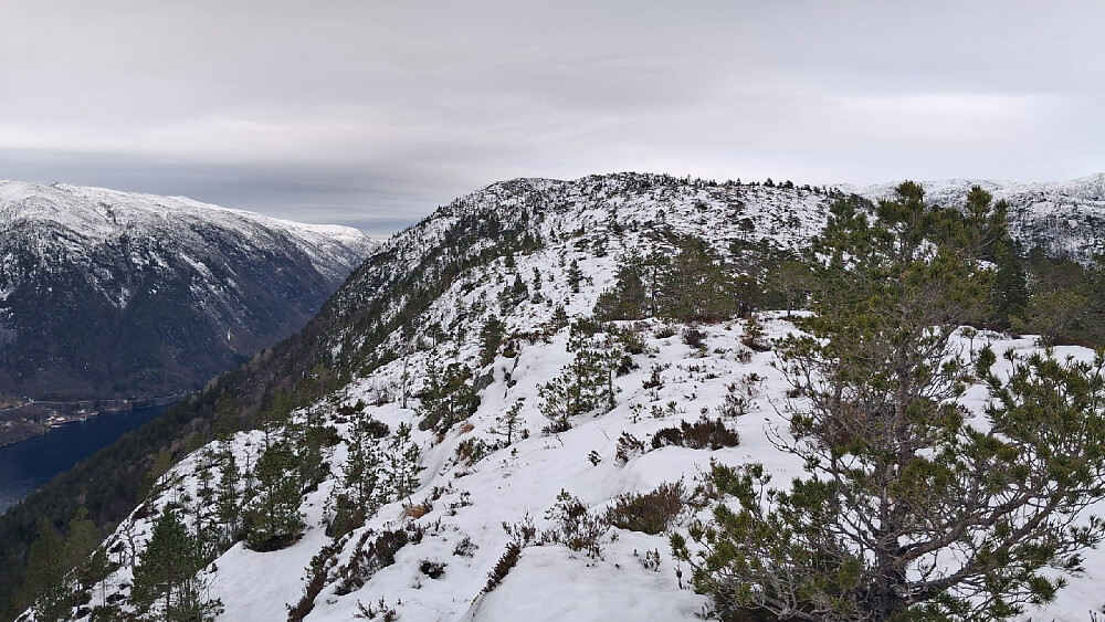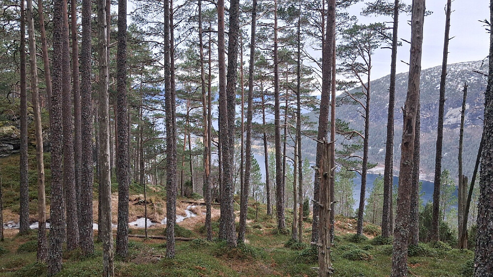 Veldig fin furuskog på fjellryggen, var ikke snø før jeg var over tregrensa. Lett å tråkke gjennom den våte snøen. 3 grader på toppen, 8 hele grader nede ved Klævold.