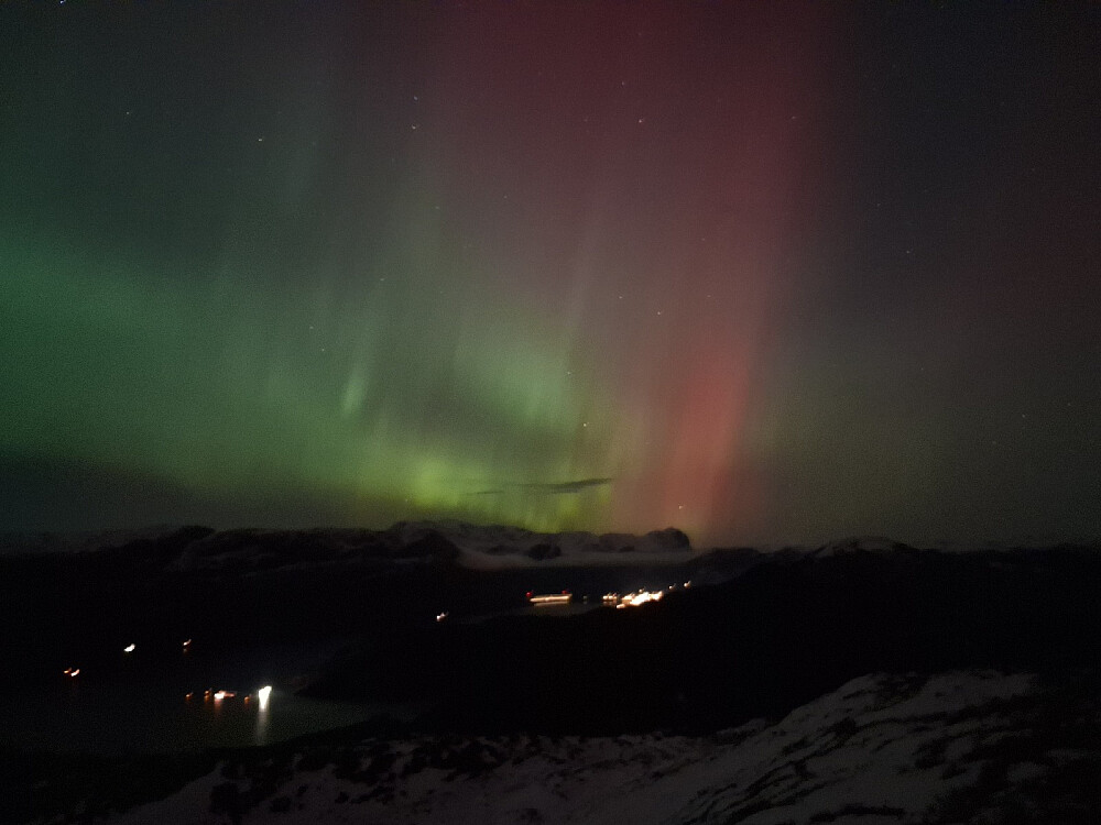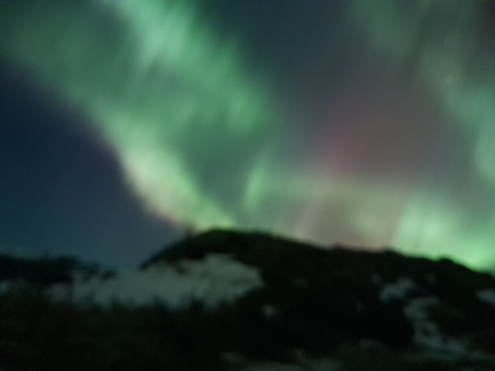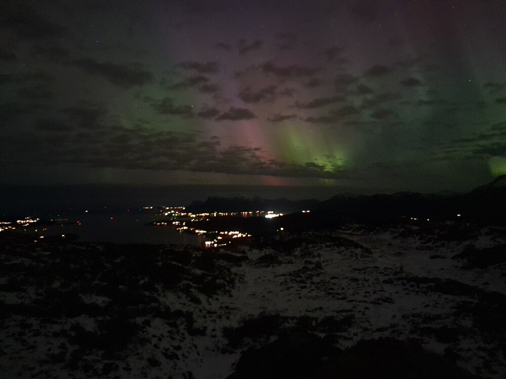 Så at det var sterk nordlys, så jeg kjørte fort til Storekleiva for å få bedre sikt. Det lyste hele turen, og det var sterkest rett før toppen. Synd at mobilkameraet på den nye telefonen min er ganske dårlig, men fikk noen greie bilder med bruk av Pro-modus.