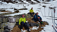 Endelig klaffet været for en Gaustatopp skitur. Som vanlig ville vi ta hele ryggen på fjellski. Trond, Halvor og jeg kjørte fra Asker i 9-tiden, så snøen var alt bløt når vi satte i gang fra Flisetjønnskaret. Vi måtte bare bære skiene et par ganger opp de første brattene. Vi gjorde et dårlig valg og holdt høyden for mye. der ble det lite snø, så vi måtte renne ned igjen litt. Det ble et par steder til vi tok av skiene, ellers klarte vi oss til omtrent 1650 moh i hovedtoppen. Der valgte vi å gå på beina resten. De med Randoné ski kunne følge bratte snøflanker til toppen. Både Halvor og jeg hadde fjellski med vanlige bindinger, og skøyteskisko. Det viste seg at de var forferdelige å gå med. De satt ikke i det hele tatt på steinene. Jeg hadde heldigvis med vanlige skisko >>>