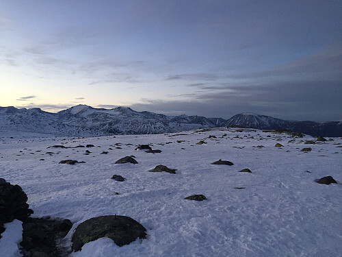 Kort fottur i solnedgangen. Lettskyet vær, vindstille og 1 minusgrad.
