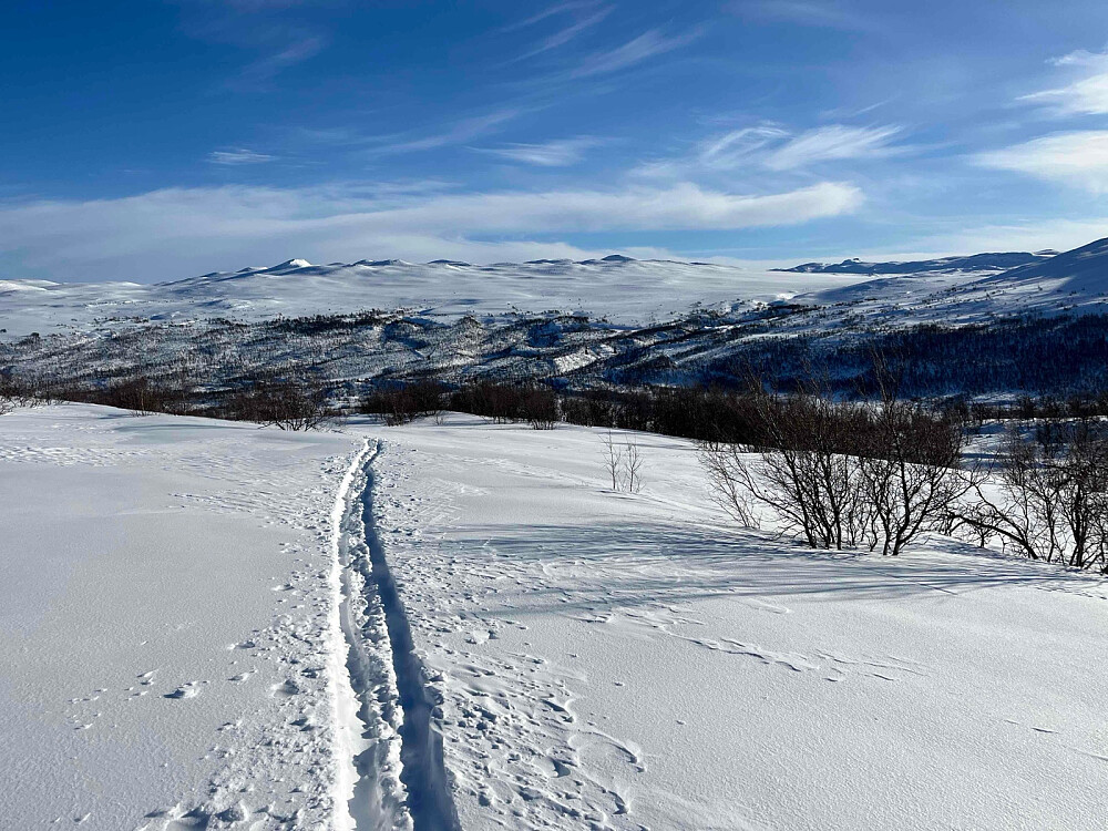 Bra skiføre, en del nysnø i terrenget. Sol og vestlig bris, et par minusgrader. Flatt terreng, utmerket for fjellskitur.