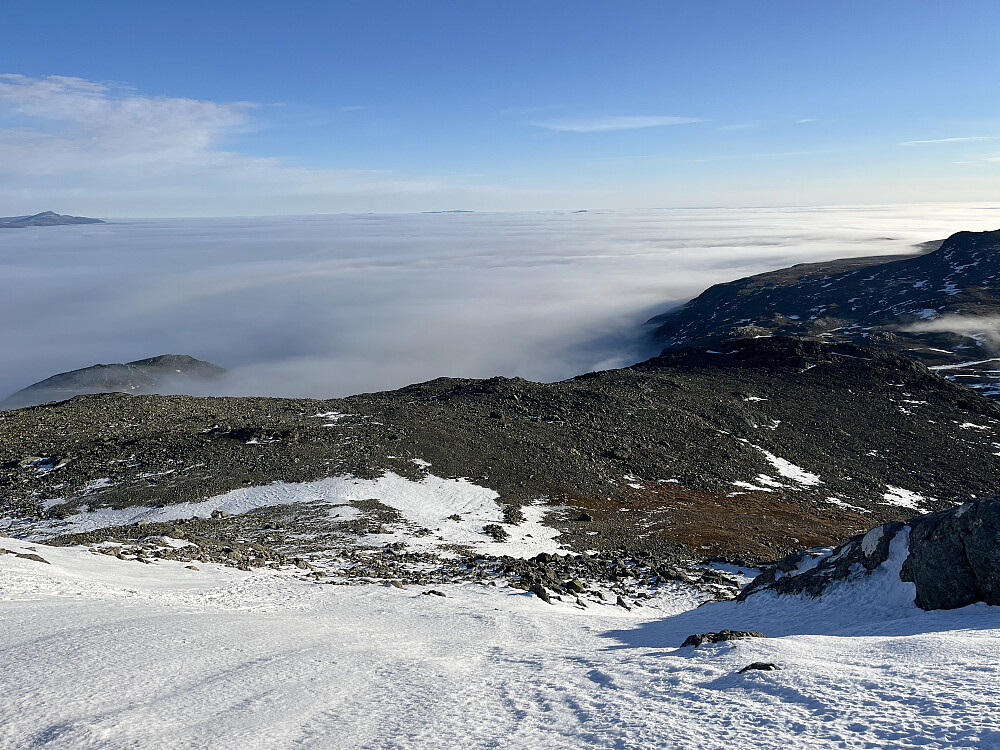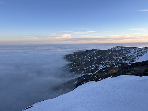 En vakker søndag over tåkehavet i lavlandet på Østlandet. Tåkegrensen lå på ca. 1400 meter denne dagen. I høyden var det vindstille, sol og plussgrader. Under tåken var det yr/snø i luften, rått, surt og flere minusgrader. Stor kontrast på én og samme tur! Svært lite snø i terrenget for årstiden, midt i november. Tok en lang pause på toppen for å ta bilder og lage timelapse av tåkeskyene. Returnerte ned igjen rett før solnedgang. Månen lyste høyt på himmelen til kvelden, så trengte ikke hodelykt tross tett tåke på slutten av turen.