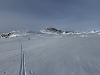 Fra Breistulen gikk det ut i terrenget, først gjennom bjørkeskog (ca. 3 km) og senere over tregrensen (ca. 1 km) til dagens første topp Veslefjellet (1166 m). Det gikk fint å gå gjennom skogen, ikke så altfor tungt å tråkke spor. Ett sted var det en åpen elv som jeg måtte gå litt oppover for å krysse den over snødekke. Det kjentes veldig kaldt denne etappen fra Breistulen frem til tregrensen nedenfor Veslefjellet. Det må ha vært >>>