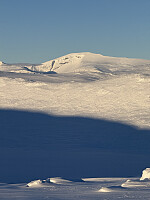 Begynte å gå vestover Flye og Fisketjerne og opp Steindalen. Det var mye folk ute i dag, og et tydelig spor gikk i retning Raslet. Ved den sydvendte breen nedenfor Rasletinden skilte det seg to spor. Det ene gikk videre flatt over Raslet, mens det andre gikk opp mot breen. Jeg valgte i dag å gå via breen. Tok en god lunsjpause ved foten av breen, det var litt kaldt, men ikke noe vind. Gikk deretter til fots opp bakken rett øst for breen halvveis opp, >>>