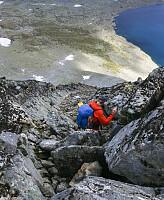 Dagen etter ble det dagstur til Stor-Svuku og småtoppene øst for, samt Litl-Svuku og Revlingkletten. Til Stor-Svuku gikk det merket sti hele veien opp, og derfra gikk vi våre egne veier bort til Revlingkletten og litt forbi. Mye kartlavbekledd ur, lange mose- og grusflater og en artig kløft i Sørbekkdalen. Ellers så vi jevnlig reinsdyr, et par halvvoksne rypekull og en hel bråte >>>