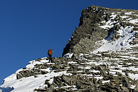 Spontantur til Sunnmøre. Samme utgangspunkt og turfølge som i fjor , men ingen tåke. Det skulle visst være kjempehøytrykk over Norges land og rike denne helga. Eneste som var potensielt upraktisk var at det lå en ukjent mengde snø over 1000 moh. Og vi ville jo fort over 1000 moh. Det ble til at vi sorterte bort fjell som innebar luftig klyving. Også sorterte vi bort fjell som turfølget hadde vært på før. Også sorterte vi bort fjell som hadde nordvendt adkomst. Heldigvis er det mange fjell igjen på Sunnmøre, og selv etter at en drøss av fjell hadde blitt utsatt for hardhendt utsortering hadde vi muligheter nok. Vi fant ut at vi kunne gå til Urkedalstinden . Der hadde ingen av oss vært før. Vi hadde et lite håp om at vi skulle greie å få med oss Bjørnetanna og litt Vellesæterhorn i samme slengen, >>>