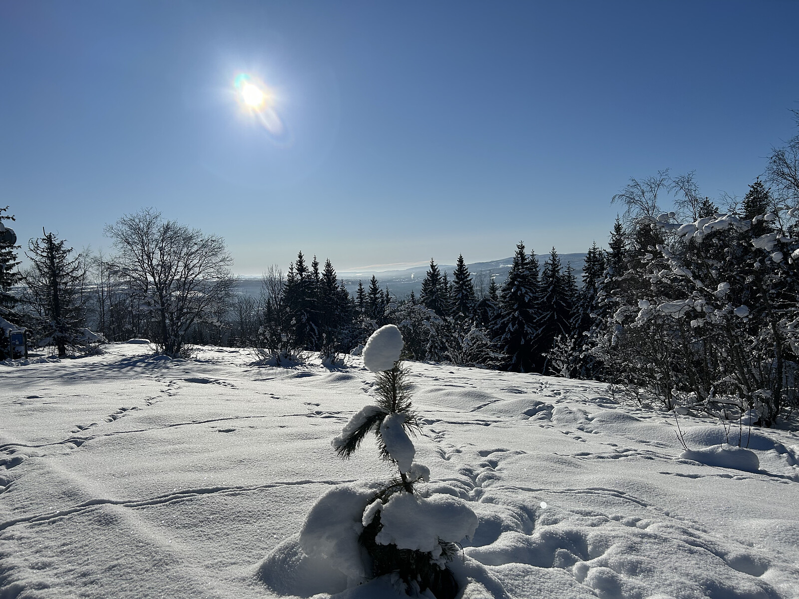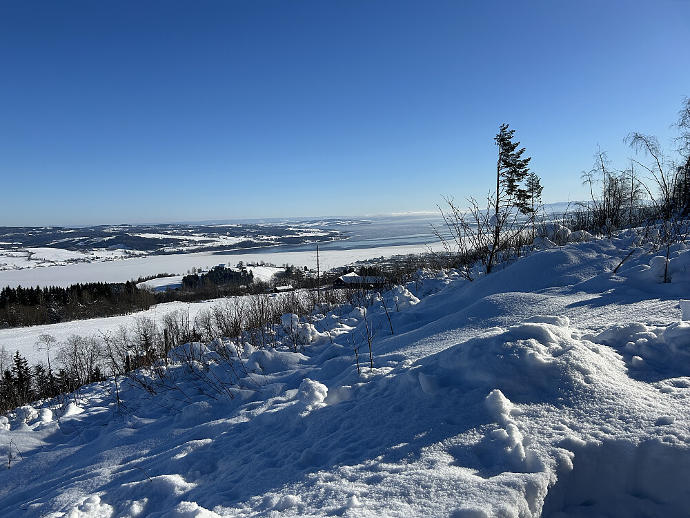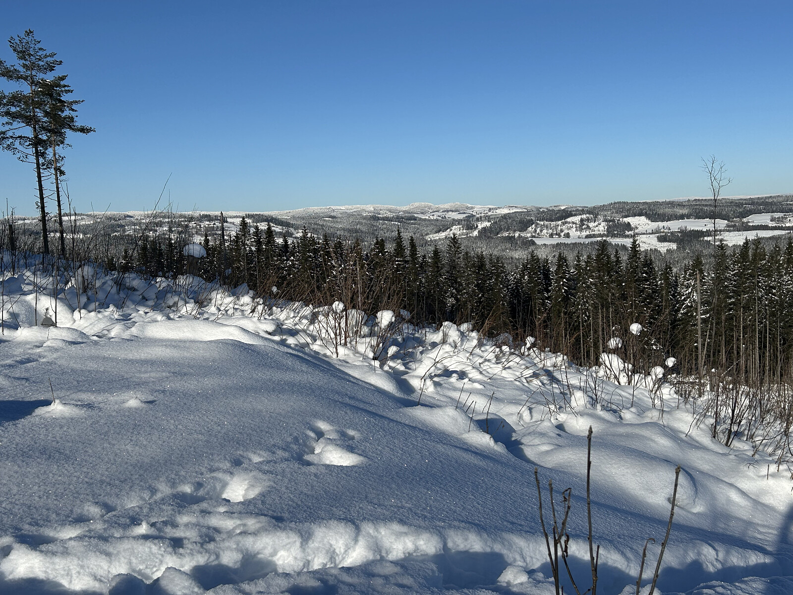Tur med Trym hjemmefra i flott, men kaldt vintervær. Minus 21 på morgenen, så jeg valgte å gå en tur til fots. Fortsatt kaldt i skyggen, men oppover Bergsjordet og på toppen varmet sola godt. Mye folk ute i akebakken på Bergsjordet i finværet.