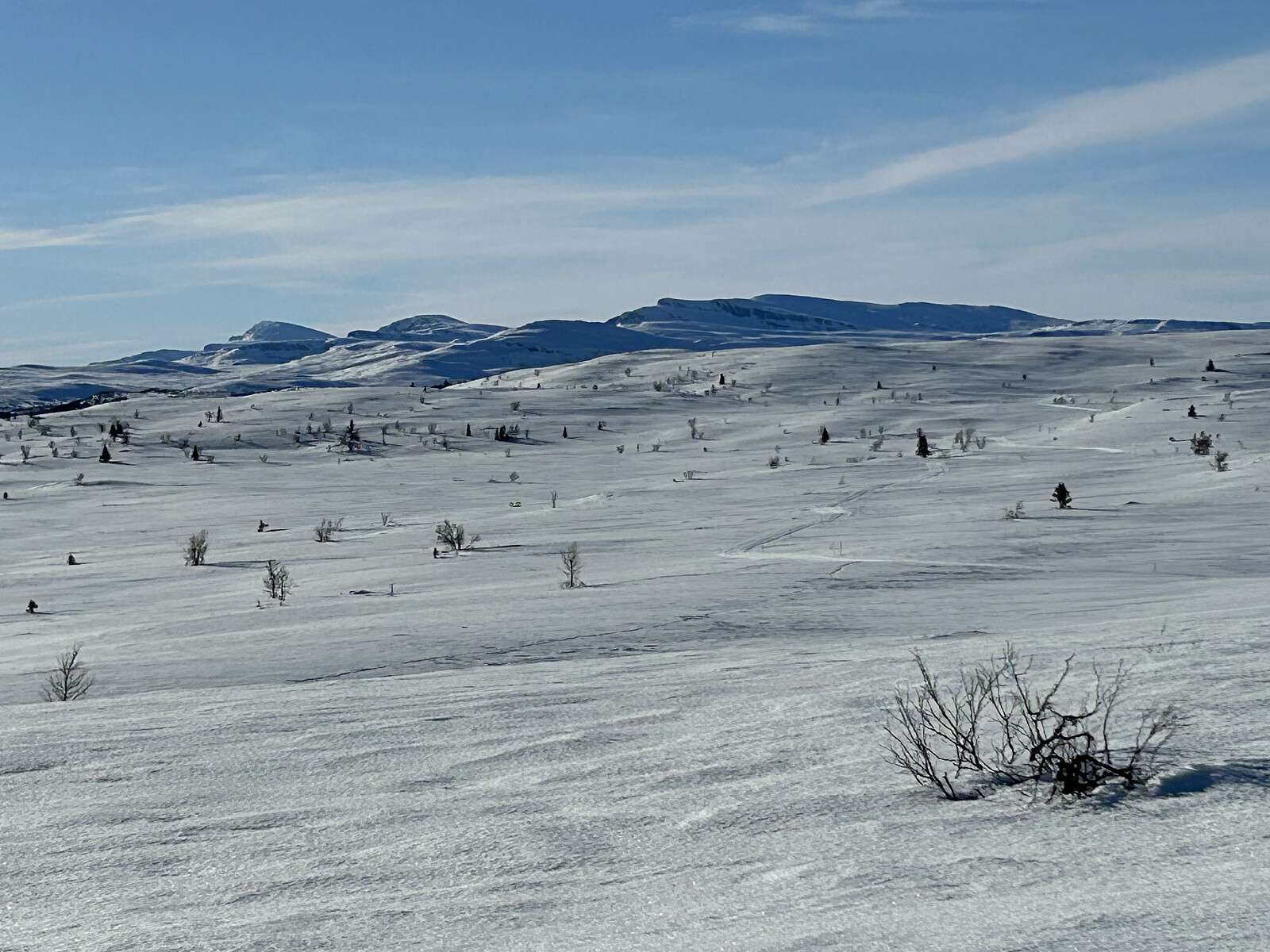 Skitur fra hytta med Trym. Mest overskya vær, med sol som vistes gjennom skyene. Frisk vind over Storhaugen og ned til Nysetra.