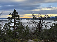 Jeg tok på meg trugene og fulgte god sti ned til Steinhaugsetra og deretter videre sørover Kløyvdalen. Et stykke nedenfor setra tok jeg til høyre i et stikryss, og så til høyre igjen på merket sti som førte meg bratt oppover sørryggen. Stien gikk opp til omtrent 800 meters høyde der hvor terrenget flater ut. Her var det flere flotte utsiktspunkter og tydelig et yndet turmål. Turen videre innover til toppunktet er nok mer for ivrige toppjegere. Selve toppkollen er ganske åpen og med rester av et trigpunkttårn som står lent opp langs et tre. Ingen utsikt herfra. >>>