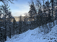 Neste stopp var Lauvåshaugen. For å unngå å kjøre nesten helt til topps valgte jeg å parkere i en lomme ved innkjøringen til hyttefeltet NV for toppen. Herfra gikk jeg langs veien et stykke og etter hvert på god sti på kanten langs hyttefeltet. Like før selve toppkollen kom jeg inn på veien igjen som jeg fulgte opp til den øverste hytta. Herfra ble det bushing de siste hundre meterne opp til toppen. Noe utsikt mellom trærne, men egentlig en ganske stusselig topp!