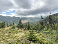 Det var ingen god sti å finne opp mot Langemyrfjellet, men stort sett greit terreng å traske i oppover dalen. Et lite stykke var det antydning til sti, men denne forsvant igjen ganske fort. Et par steder litt tett med trær/busker, og noen steder små omgåelser pga skrenter. Det var tåkete på toppen, noe som gjorde at den sannsynlige utsikten glimret med sitt fravær denne dagen. Heldigvis var det grei sikt både på tur opp og ned.