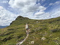 Solskinnstur fra hytta og opp til Karihaugen med Cecilie og Kristian. Etter en matpause på toppen fortsatte vi videre til Anaripigg og Horrtjørnan. Det var godt å gå litt på mykt underlag igjen etter den lange steinvandringen til Veslesmeden dagen før.