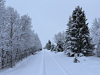 Ulempen var at veien ikke var brøytet. Utenom de 30-40 centimeterne med snø var det kun et par dype traktorspor fra noen dager tidligere som viste på veien. Jeg fant frem trugene og la i vei innover mot Raudhaugen. Traktorsporene kunne følges til veis ende der hvor traktoren hadde snudd, og videre oppover ble det ganske utfordrende i lyngen og den løse snøen. Det ble heldigvis litt bedre etter hvert som jeg nærmet meg toppen, og snart kunne jeg puste ut ved siden av stolpen som markerte toppen. Det var også satt opp en krakk der oppe. >>>