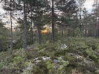 På vei tilbake fra Kittilskollen stoppet jeg på Høgset parkeringslomme. Herfra går det en solid sti innover, men dessverre stopper den ved en gapahuk etter kort tid. Videre innover mot Tiurkollen er det litt ulendt, men innimellom ser man antydning til litt sti/tråkk. Slik var det også opp bratta til toppen. Selve topplatået var stort og flatt, med en markert kolle som det høyeste punktet. En bitte liten varde markerte selve toppen, og det var litt utsikt mellom trærne i vestlig retning. På vei tilbake gikk jeg også oppom Bjørbekkollen. Like nedenfor toppen var det turpostkasse og grillsted. Trolig har det nok vært en fin utsiktplass her tidligere.