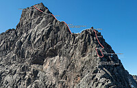 Artikkelen er delt i tre deler og beskriver Normalruta opp til Storen (rød rute på kartet), Skagastølsryggen (blå >>>