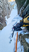 Slo til med spenstig variant jeg har såvidt sett litt på ved tidligere anledninger men ikke ansett som innenfor det jeg er kompetent nok til. Kartet viste flere umuligheter opp renna, så gikk mot dette prosjektet med lite håp om suksess. 40m opp i renna, noe eksponert klyving over sva med litt is på og dårlig snø. Riktig valg med litt aggressiv isøks her. 80m opp i renna ligger ei stor steinblokk sett i bildene under. 20m vertikal klatring på begge sider av denne. Jeg gikk under ettersom lys viste mulig åpning. Isklatring over ca 15m med 70-80 graders helning inn under blokka, grad WI3+. Så ett mer spennende opptak i toppen og ut igjennom snøtunnel. Regner med denne er helt nedsnødd på mer snørike vintre. Måtte ta det pent, rolig og ha fullt fokus på riktig plassering av isøkser >>>