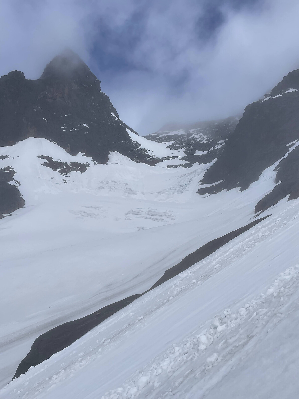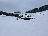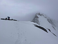 Føringstur for Øystein til Nørdre Maradalstinden. Tur/retur Skagadalshytta. Litt tåkete til å begynne med, men det letnet utover dagen. Fulgte primært snøfelter opp fra Slingsbybreen direkte mot Nørdre Maradalstinden. Jevnt over 40 graders flanke mesteparten av veien, så gjaldt å holde konsentrasjonen opp og ned. Forserte et punkt med klyving på vei opp (variant mot vest), men tok en variant lenger øst ned igjen på snø som var steinhard.