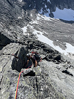 Føringstur for Gunnar over Semelholstindtraversen. Litt kronglete oppstigning mot Nørdre i nedre del. Kanskje bedre å holde lenger mot øst og runde det bratteste? Morsom travers med flere eksponerte punkter. Litt køddent å finne egnet standplass etter siste taulengde før toppen, men måtte forlenge fra sikringer over kanten mot sør. Sikksakket oss en del på breen ned igjen for å holde oss på snø og slippe stegjern på is.