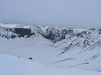 Føringstur for Geir til Gjertvasstinden. Syklet fra Helgedalen og opp til Styggedalsdammen. Geir fikk låne min el-sykkel. Begrenset sikt og ganske tung snø store deler av turen opp. Gikk også en del naturlig utløste skred som gjorde at vi gikk opp via "Baronessebreen" i stedet for Gjertvasskaret. Er nok siste gang jeg går opp på ryggen fra midt på Baronessebreen. Mye løst og ekkelt terreng her med nylig framsmeltet fjell. Bedre å gå opp der jeg gikk ned igjen (østlig variant). Mye snø å følge ned igjen.