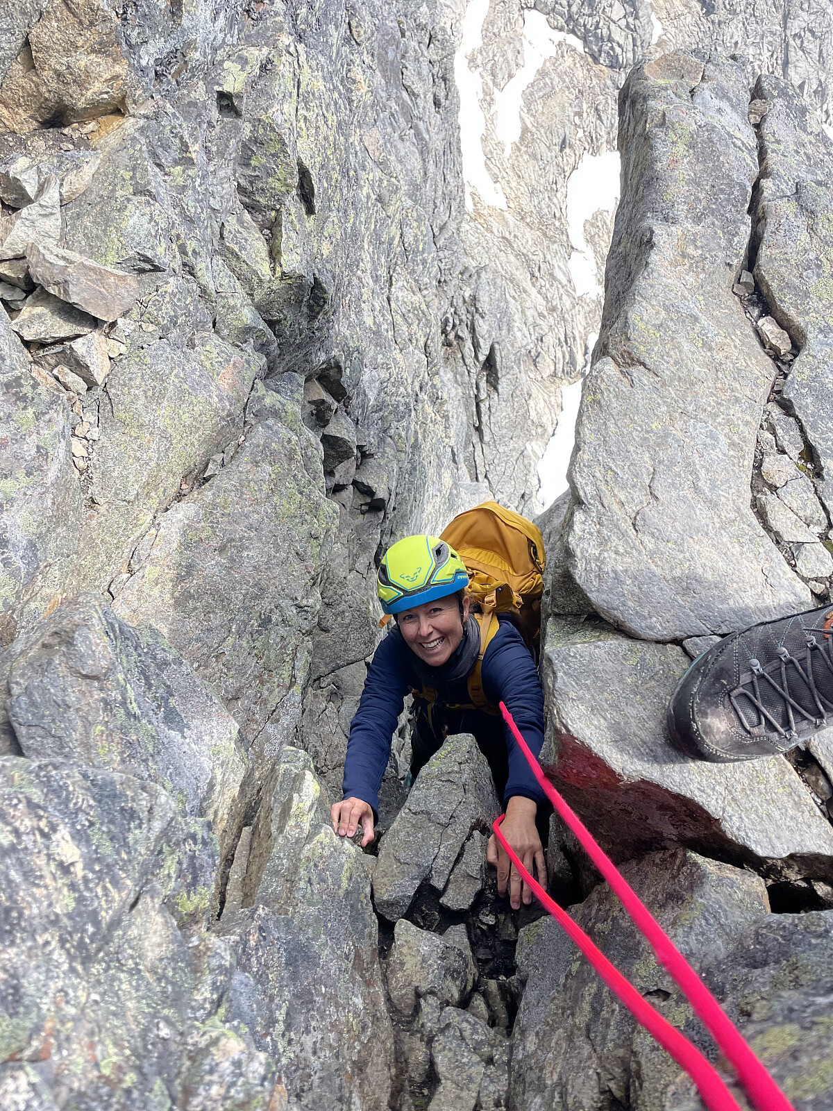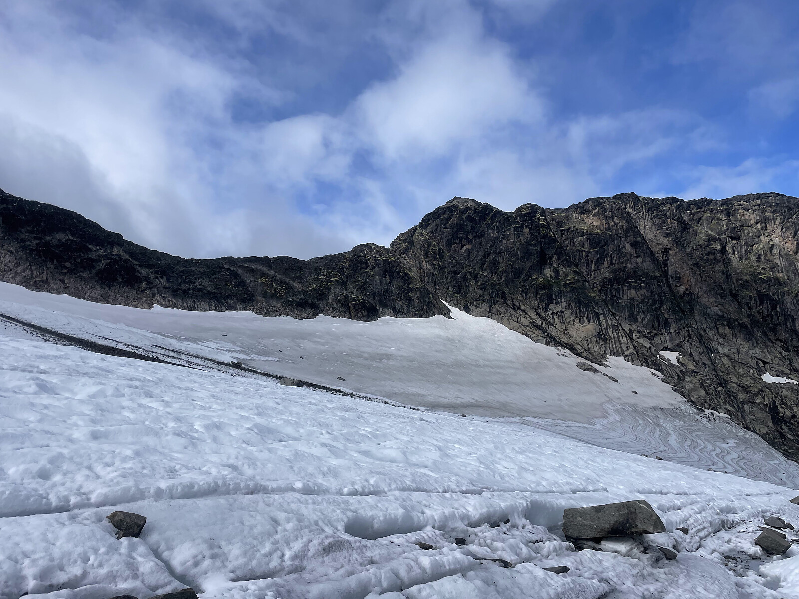 Føringstur for Terje til Kvanndalstinden. Start i Vengedalen og følger sti opp til Olaskarsvatnet. Må følge med på denne stien, og fort gjort å havne for høyt opp mot Halls renne på Romsdalshornet. Møtte en kjapp amerikaner som gjorde nettopp det. Sporadisk varding bortover langs vannet. Deretter ut i terrenget og skrå opp mot breen vest for toppen. Litt rutefinning for å ikke havne i litt ekle svapartier. Pga blåis valgte vi å holde litt lavt langs en snøfonn før vi krysset selve breen. Sikkert flere plasser å klatre opp på selve ryggen, men vi holdt litt ut mot venstre langs en rampe. Sikret noen lengder opp her. Deretter lett bortover ryggen før det etter hvert bratnet til opp en markant hammer. Her er det enklest å runde litt ut mot venstre side. Først moderat klyving, >>>