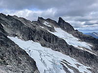 Føringstur for Terje til Eggen. Start fra Vargebakken og fulgte sti opp til Bukkehåmårtjønne. Herfra gikk resten av ferden uten sti. Opp fra vestenden av tjernet fulgte vi sporadiske varder og fant en fin trasé opp mot pkt 1899. Rundet deretter Kvassryggen på nordsiden på fine hyllesystemer. På vei inn til breen nord for Høgdebrotet fant tok vi et litt dårlig veivalg på vei fram pga mye morenemasser. Bedre der vi gikk tilbake selv om det krever litt mer høydemeter. Lå litt snø i høyden som var i ferd med å smelte. Veldig glatt der det var mosedekt. Gikk greit å krysse breen uten stegjern. Tok på klatreutstyret på den andre siden. Greit å ta seg opp på ryggen fra breen. Opp sørryggen klatret vi det i tre taulengder med 30 meter tau, med litt tautransport i midten. Kan muligens >>>