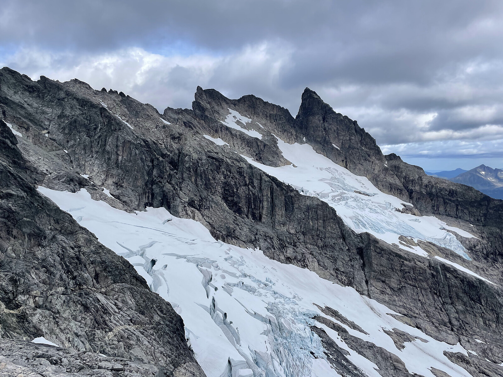 Føringstur for Terje. Plan A var å klatre nordøstryggen på Store Trolltinden med start på Soggemoen og slutt på Trollstigen. Det hadde regnet i går kveld, og det kom litt yr på morgenen i dag også selv om det ikke var meldt. Holdt et jevnt tempo opp til Nørdre Trolltinden, men da steinene fortsatt ikke hadde tørket opp besluttet vi å snu der og gå ned igjen.