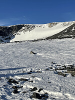 Føringstur for Terje til Eggen. Start fra Vargebakken og fulgte sti opp til Bukkehåmårtjønne. Herfra gikk resten av ferden uten sti. Opp fra vestenden av tjernet fulgte vi sporadiske varder og fant en fin trasé opp mot pkt 1899. Rundet deretter Kvassryggen på nordsiden på fine hyllesystemer. På vei inn til breen nord for Høgdebrotet fant tok vi et litt dårlig veivalg på vei fram pga mye morenemasser. Bedre der vi gikk tilbake selv om det krever litt mer høydemeter. Lå litt snø i høyden som var i ferd med å smelte. Veldig glatt der det var mosedekt. Gikk greit å krysse breen uten stegjern. Tok på klatreutstyret på den andre siden. Greit å ta seg opp på ryggen fra breen. Opp sørryggen klatret vi det i tre taulengder med 30 meter tau, med litt tautransport i midten. Kan muligens >>>