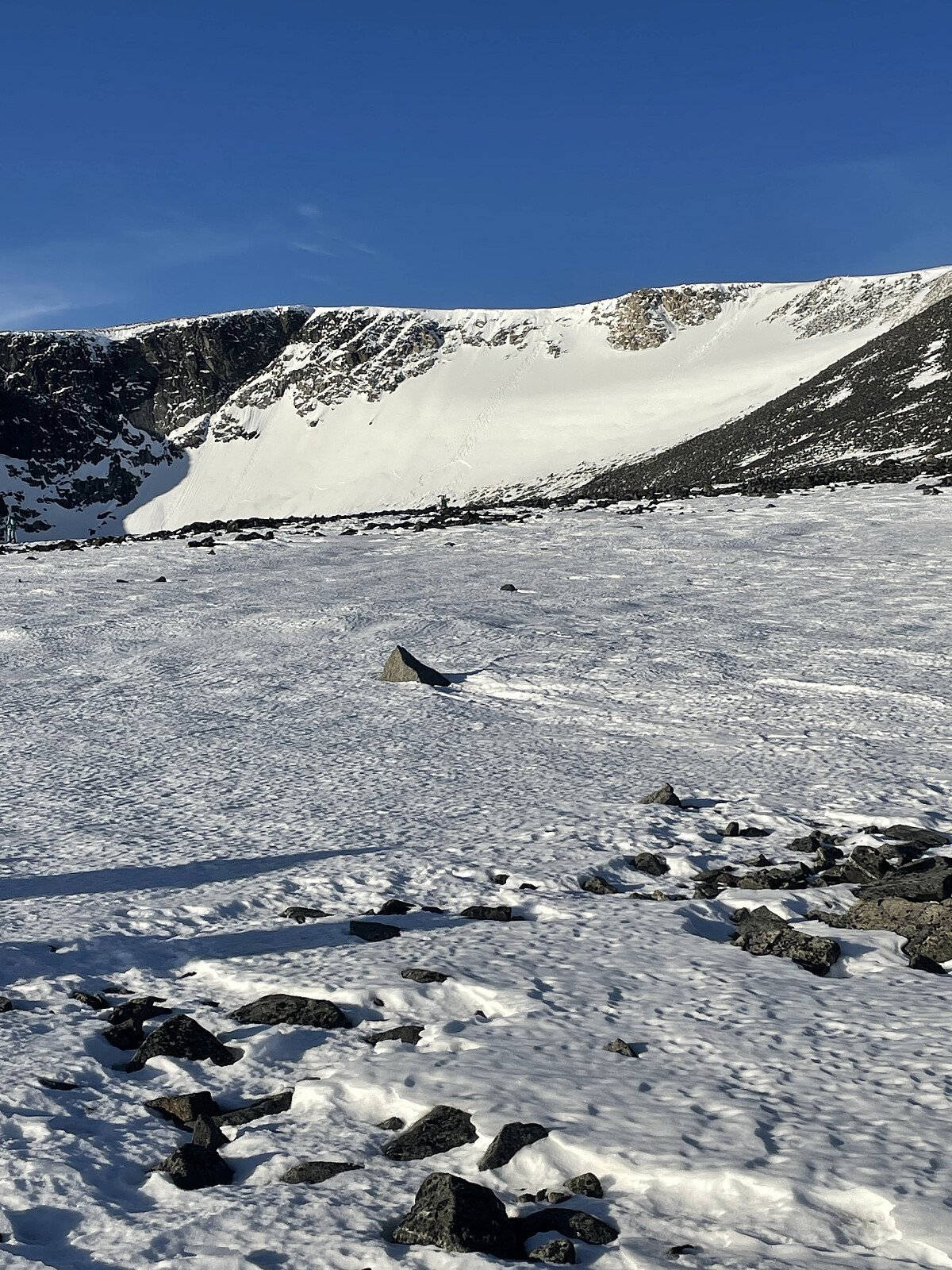Føringstur for Terje til Kvanndalstinden. Start i Vengedalen og følger sti opp til Olaskarsvatnet. Må følge med på denne stien, og fort gjort å havne for høyt opp mot Halls renne på Romsdalshornet. Møtte en kjapp amerikaner som gjorde nettopp det. Sporadisk varding bortover langs vannet. Deretter ut i terrenget og skrå opp mot breen vest for toppen. Litt rutefinning for å ikke havne i litt ekle svapartier. Pga blåis valgte vi å holde litt lavt langs en snøfonn før vi krysset selve breen. Sikkert flere plasser å klatre opp på selve ryggen, men vi holdt litt ut mot venstre langs en rampe. Sikret noen lengder opp her. Deretter lett bortover ryggen før det etter hvert bratnet til opp en markant hammer. Her er det enklest å runde litt ut mot venstre side. Først moderat klyving, >>>