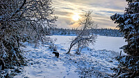 Fin tur med Ståle og Embla. Ble en gråvær stue med en lysstripe i sør. Ca 1-2 minus og nesten vindstille. Jeg hadde med skøyter i deg og testet istykkelsen på begge de store vannene. Ca 12 cm og tykk nok i massevis. Droppet å teste skøytene da jeg er kresen på isen på høsten. Da skal jeg ha BLANK is. Dessverre var det kommet et tynt snølag som forringer den følelsen å gå på "ei glassrute". Forsøkte oss på et lite bål på Buffrifjellet, men det ble liksom ikke noe fart i det idag. Matpause der. Helt på slutten økte vinden litt og det kom noen snøfnugg.