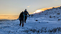 Dette var en tur jeg har tenkt på lenge. Det ble nok litt i seineste laget mtp høstfarger og varm sol. Fikk heldigvis turfølge i dag. Fikk med Morten og Terese. Terese og jeg reiste fra Gjøvik kl 05.00. Det var mørkt og kaldt...og kald skulle dagen bli til fjells også. Vi plukket opp Morten nær Beitostølen og reiste så videre over Valdresflya for å komme oss videre til startstedet som var ved parkeringsplassen inne ved Griningsdalskampen. Det går en vei fra hovedveien inn ved Nedre Sjodalsvatnet...ved Postfurua. En vanvittig flott soloppgang som farget 2000m toppene med et rått lys. Synd dette lyset bare varer i få minutter