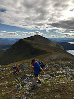 Endelig var dagen kommet for å prøve seg på traversen mellom Stabben og Inderbergssalen. Uvanlig for meg å starte på tur sammen med så mange. Det ble flere trivelige bekjentskaper, itillegg til en del gamle bekjente. Var faktisk tre andre Peakbookere med på turen. Foruten oss 27 stk på KNT-tur var det en gruppe på 12 fra Aure il. De kom seg avgårde en halvtime før oss slik at det ikke ble noe ekstra venting på de vanskelige punktene. Tok lang nok tid med så mange som vi var. Det ble lagt ut tau noen steder som hjelp for dem som var usikre. Luftig var, sleipt også også pga regn de siste dagene. På det siste vanskelige punktet skjedde det en nestenulykke. Var ikke trivelig å sitte på toppen og høre det rase stein når det var folk i bratta.Heldigvis ble >>>