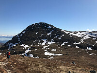 Etter en traurig vinter var det på tide å begynne litt samling igjen. På turen oppover så vi ikke mindre enn 6 elger på vegkanten. Det var overskyet så vi tok det rolig for solen skulle dukke opp ut på dagen. Varmt var det allikevel. En del ryper og hundrevis av rein var å se. En del folk var også på tur mot denne toppen, men hovedtyngden hadde Tjønnholtinden, Høgdebrotet og Rasletind som mål. Akkurat da vi ankom toppen dukket sola fram, så da ble det en lang pause på toppen. Utsikten fra denne toppen er i toppklasse. Turen ned ble fin med passe opptint snø/skare. Etter middag i bobilen gikk vi en tur til Gjendesheim for en pils. Pilsen var god, prisen drøy. Her var det stinn brakke pga Toppturcamp.