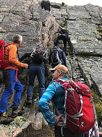 Endelig var dagen kommet for å prøve seg på traversen mellom Stabben og Inderbergssalen. Uvanlig for meg å starte på tur sammen med så mange. Det ble flere trivelige bekjentskaper, itillegg til en del gamle bekjente. Var faktisk tre andre Peakbookere med på turen. Foruten oss 27 stk på KNT-tur var det en gruppe på 12 fra Aure il. De kom seg avgårde en halvtime før oss slik at det ikke ble noe ekstra venting på de vanskelige punktene. Tok lang nok tid med så mange som vi var. Det ble lagt ut tau noen steder som hjelp for dem som var usikre. Luftig var, sleipt også også pga regn de siste dagene. På det siste vanskelige punktet skjedde det en nestenulykke. Var ikke trivelig å sitte på toppen og høre det rase stein når det var folk i bratta.Heldigvis ble >>>