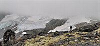Dette er ein tur som eg kan like som aller best! Naturen er rå og mektig! Middagsnibba 1443 ligg lite inne med info om rute opp! Sett vekk ifrå at ein kan nå den fint på ski via Hanekammen 1651 moh. Ekstra kjekt då å finure terrenget som tilsynelatande ser knotete ut til fots ifrå nye kanter. Skodda låg trolsk idag med yr på toppane! Det la likevel ingen hindring på utforskningstrangen og ein eventuell retur. Nydelige haustfargar og fantastisk å studere breane & brefalla som Melkevollbreen & Briksdalsbreen/Jostedalsbreen. Ingen ting anna å seie enn stor fascinasjon for naturen i dette riket!