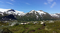 Det er noko merkeleg med Snoavarden og Kvannebakkbu....Ein spesiell stad som ein rett og slett berre finn fred og ro! Sommaren har gått så fort og med mykje snø i fjella...så har eg drøya med å ta turen opp til fot`s. Snakka med Joar om han visste noko om snøforholda, heldigvis nevnde han på å ta med stegjern. Dei fekk eg bruk for over snøfonna, den er ikkje så høg men den lille biten var hard og isete. Stille og fredeleg var det her, ingen spor å sjå etter folk og dyr på breen. Sterk og kald vind gjorde beisøkta kortvarig, så eg kosa meg med utsikt, stilla og dugeleg niste, før eg russla ned att til bygda!