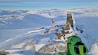 Kort kjapp Rando-tur etter jobb i dag. Litt hardt føre. To mm. styresnø litt oppe i fjellsida. Fint ver og nydeleg utsikt frå toppen. Grei køyring nedatt, men måtte jobba aktivt med stålkantane.