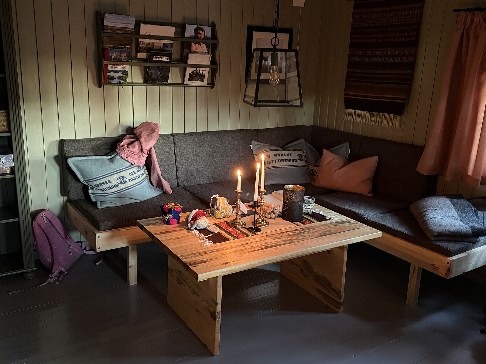 Parkerte ved Hvaltjern P-plass. Det er vanligvis god grusvei innover, men nå var det ikke mulig å gå den vanlige veien. Tror de driver meg restaurering av veien, for nå var den fullstendig gjørmete og ufremkommelig. Måtte gå en liten omvei, nærmere Fetveien. Ved nordøstenden av vannet slora var det mulig å komme inn på grusveien igjen. Fulgte skilt og god grusvei nesten helt til døra på hytta. En familiefar og hans 2 døtre hadde bestilt hytta for helgen. Men de var trivelige og jeg fikk lov til å ta meg en tur inn for å ta noen bilder. Flott hytte.