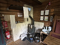 Kjørte tilbake til Tverrsjøstallen, og sørover på Sinderdalsveien. Like nord for vannet Store Sindera, har det kommet opp en ny relativt stor parkeringsplass. Parkerte her. Herfra på god sti rett sørover til man kommmer til en trebru. Rett over trebrua ligger Sinnerdammen. Fin lita hytte og veldig koselig og sjarmerende inni.